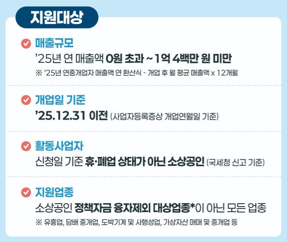 지원 대상 조건(연매출 등)은 2026년도 기준으로 변경된 부분이 있을 수 있습니다. 따라서 공고문을 다시 확인하거나, 공식 안내를 통해 정확한 요건을 반드시 체크해야 합니다.